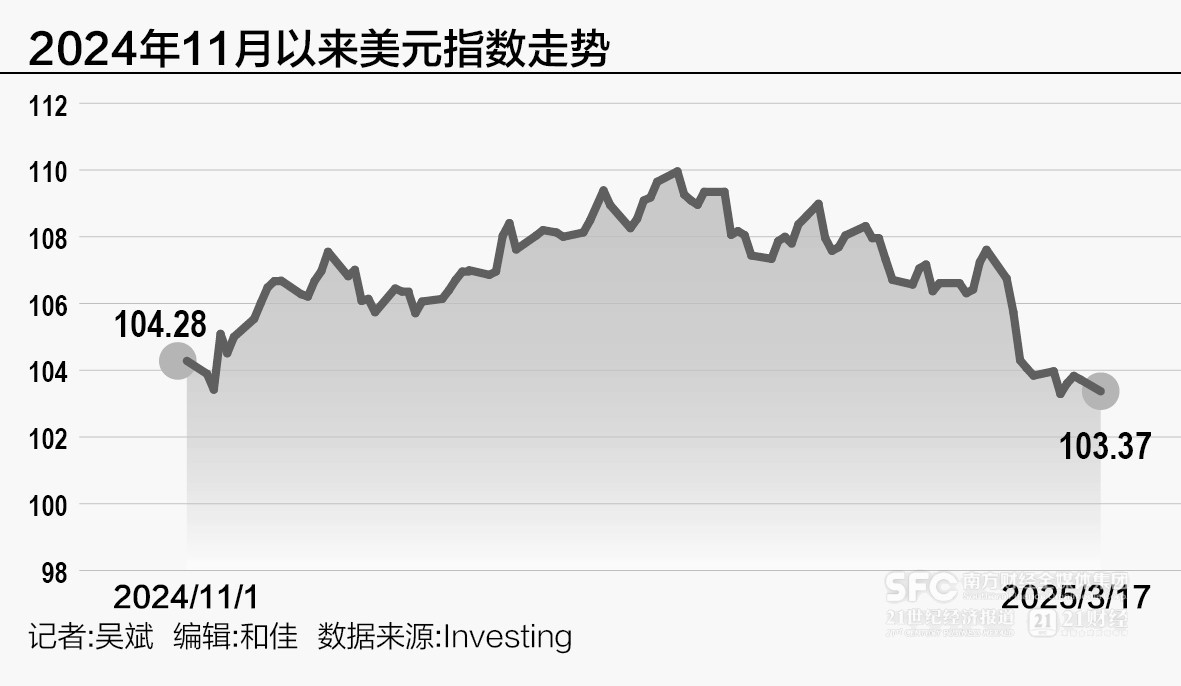 东吴证券首席经济学家芦哲对21世纪经济报道记者分析称,本轮美元指数下跌的主要原因是对美国经济衰退与特朗普政策不确定性的担忧。近期美国经济数据接连走弱,2月制造业PMI与非农就业数据不及预期。此外,特朗普近期频繁释放“紧财政”信号,市场预期这将抑制总需求,压低增长和通胀。“弱数据”+“紧财政”的组合与特朗普反复无常的贸易关税政策令美股和美债收益率不断走弱,带动美元指数大幅下跌,形成“股汇双杀”的局面。“股汇双杀”也反映出市场对特朗普政策实际效果缺乏信心,避险情绪从美元转向黄金、日元等资产。